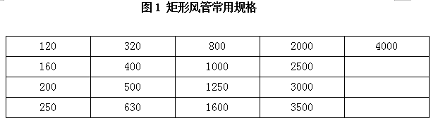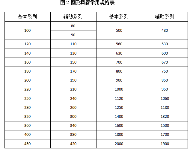 在安裝條件允許的情況下,在實(shí)際設(shè)計(jì)制作管道時(shí),還需要根據(jù)需要選擇合理的結(jié)構(gòu)尺寸。根據(jù)《通風(fēng)管道技術(shù)規(guī)程》(JCJ141-2004)的規(guī)定,矩形風(fēng)管的邊長(zhǎng)與圓管直徑應(yīng)盡量選用常用規(guī)格,見表1和表2。矩形風(fēng)管長(zhǎng)邊與短邊之比不宜大于4:1。金屬矩形風(fēng)管宜以外邊長(zhǎng)(或外徑)為標(biāo)注尺寸;非金屬矩形風(fēng)管宜以內(nèi)邊長(zhǎng)(或內(nèi)徑)為標(biāo)注尺寸。圓形風(fēng)管應(yīng)優(yōu)先選用表2中的基本系列。以下各表選自《通風(fēng)與空調(diào)工程施工質(zhì)量驗(yàn)收規(guī)范》(GB50243-2002)