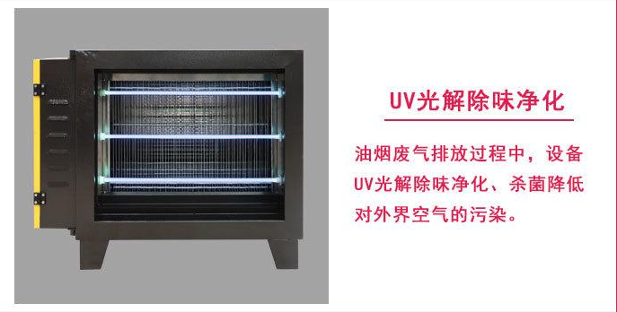 工作原理:利用UV紫外線光管發(fā)射高能C波段的光,紫外線光束改變油質(zhì)的分子鏈,并與空氣中的氧反應產(chǎn)生臭氧,臭氧將油煙微粒降解成微量白色粉末、水和二氧化碳.形成冷燃燒,對煙道中的異味也具有氧化消除作用。通過排風管道排出室外。這一技術易于安裝,凈化效率高,操作簡便,維護和使用費用非常低,無二次污染,在管道和排煙罩內(nèi)安裝,體積小,設置藝處理得當,風阻小。由于光解反應需要運行過程,對風速、煙道長度都有具體要求、有的產(chǎn)品要求管道內(nèi)運行長度不能低于17m,有的要求更長。紫外線光管對防潮和表面清潔有要求,還需要防止紫外線外射傷人。