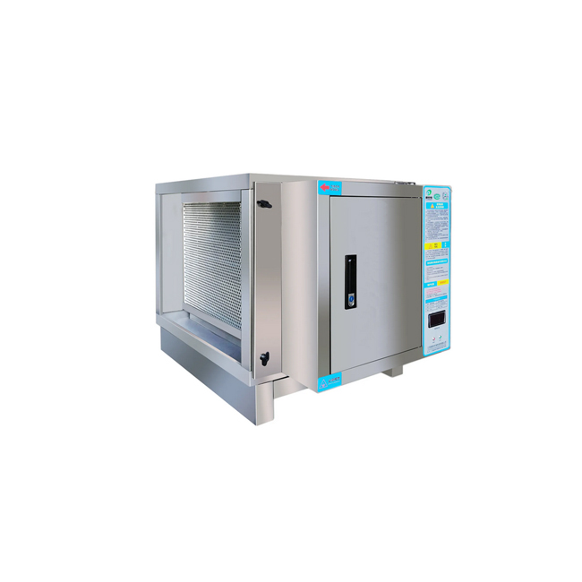 低空油煙凈化器為雙區(qū)式靜電吸附型,用來(lái)去除細(xì)微粒徑油煙分子和其它空氣中的雜粒。雙區(qū)式是指內(nèi)部電場(chǎng)的高壓電離區(qū)與低壓吸附區(qū),氣體中的油煙微粒在經(jīng)過(guò)電場(chǎng)的高壓電離區(qū)時(shí),油煙分子會(huì)被電離并帶有正或負(fù)電荷;之后經(jīng)過(guò)低壓區(qū)時(shí),將會(huì)因電場(chǎng)力的效果而吸附在極板上,流向集油槽。